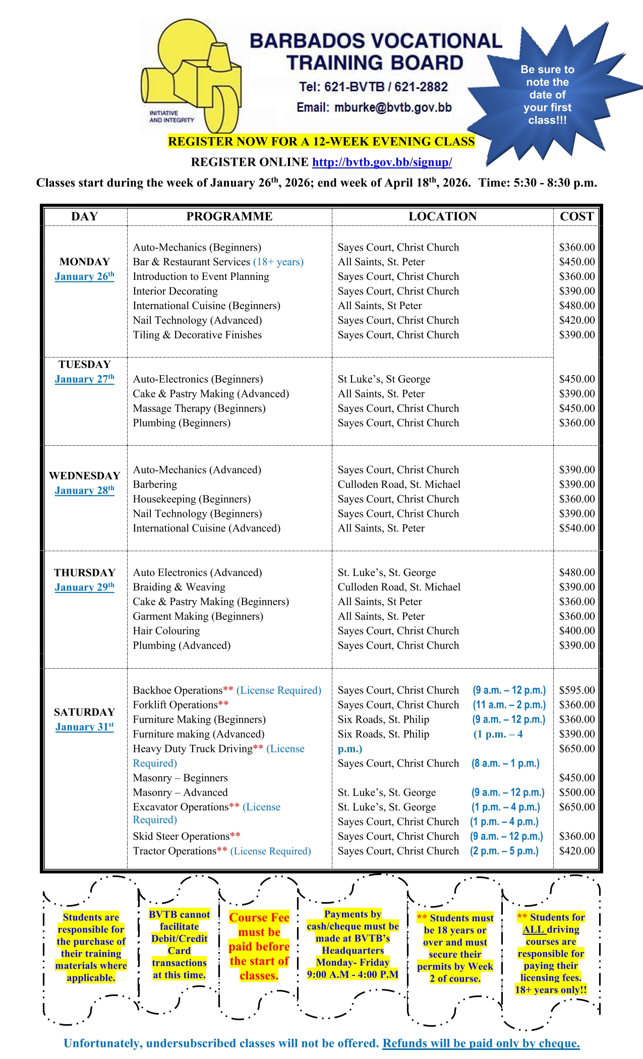 All Evening Programme registrants are asked to note that the start date for the Evening Programme is the week of January 26, 2026 according to your designated class day. Interested persons may apply online at any time, however requisite fees must be paid at BVTB Headquarters on Culloden Road, St. Michael (cash or cheque only). See our class schedule here.
